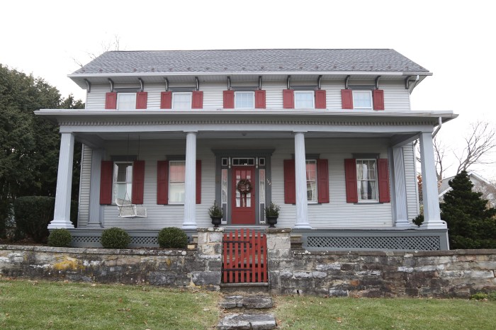 This house is a combination of German, Georgian, and Victorian influences. The current center gable Victorian home, with tall windows, steep roof, and turned “gingerbread” trim, reflects renovations and features added ca. the late 1880s. An earlier version of this house was owned by George Jack (1837), an early settler of Boalsburg. The walls of the house are made of partially crumbled mud-brick between studs with clapboard siding placed on top. The next owners, George and Elizabeth Jack Boal, had a “large plaster house and stable” when they sold the property to Ezra Brisbin in 1863, who in turn sold it to Brigadier General John S. Brisbin 1867. John Brisbin had served in the medical corps during the Civil War, was a successor to General Custer, and later was in charge of surveying all fences in the United States.