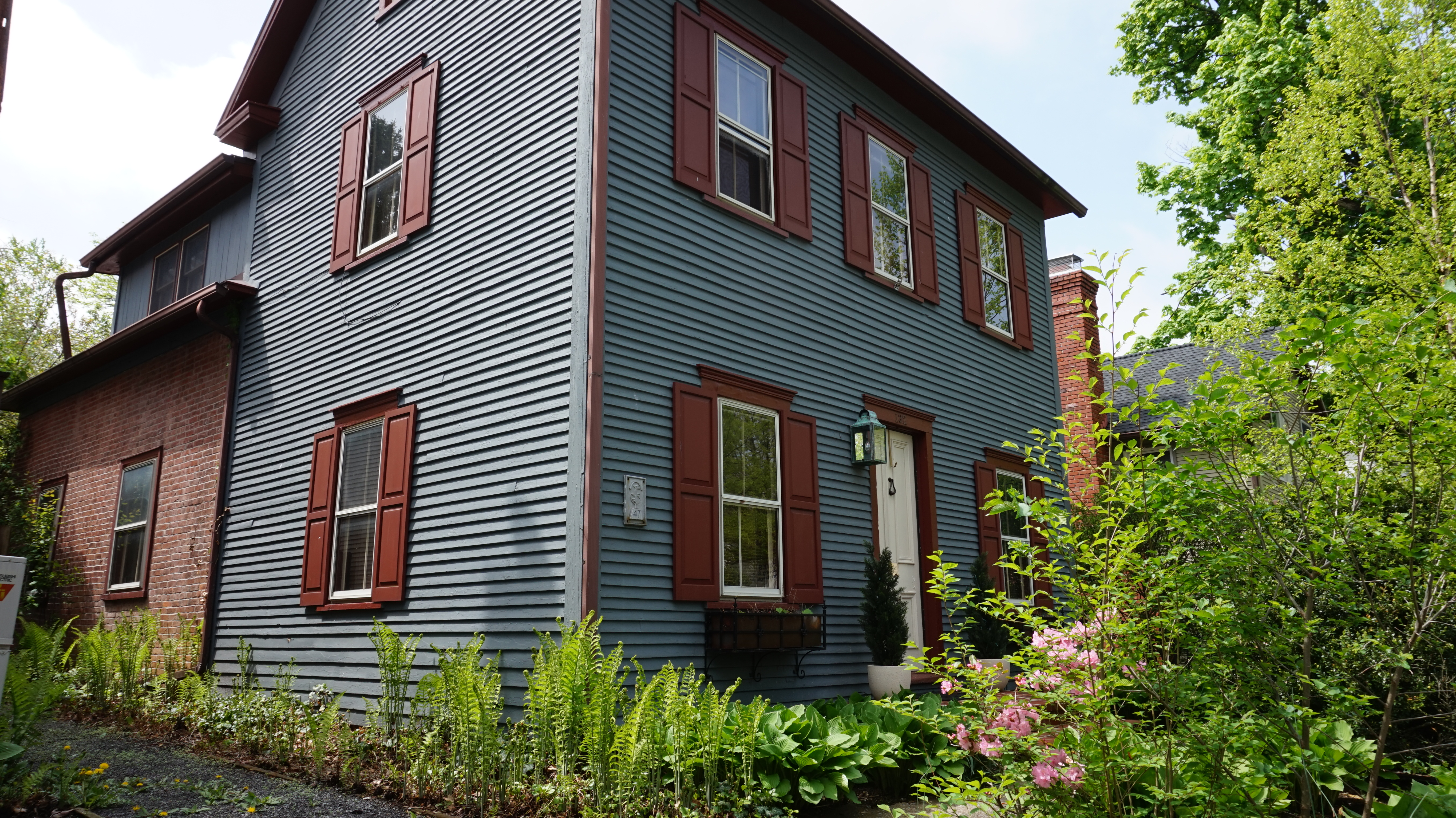 This house was built with Italianate embellishments (popular in the 1850s to 1880s) that give it a touch of elegance. Note the Italianate lintels above the windows and the scroll saw brackets that decorate the cornice, gables and porches. The recessed side porch on the east side of the house is an unusual feature. As was typical for the period, the shutters are solid on the ground floor, but are louvered on the upper floor. This arrangement provided more privacy at the ground floor level, and helped keep out street dirt and noise. The louvered shutters on the second story provided better air circulation and a cooling breeze at night.