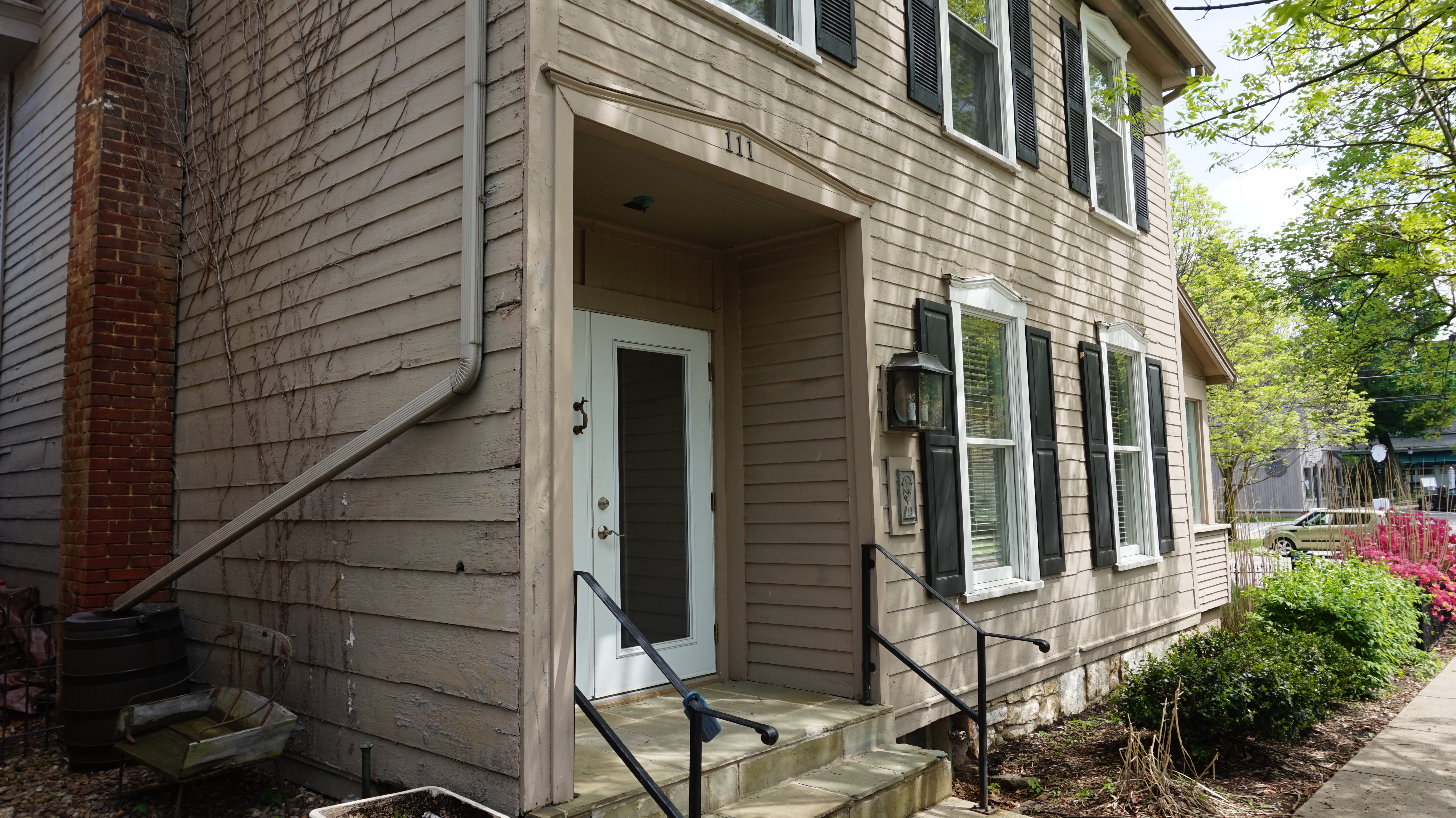 This 1 ½ story house was originally part of the property at 132 W. Main St. (HM #47). It may have been one of the “outbuildings” listed on a property deed in 1850. However, the description of a “frame store house stable”, which is almost certainly a reference to this structure, does not appear until a deed in 1895. The property was purchased in 1858 by a shoemaker, John “Daddy” Sechler, who lived in a 1 ½ story brick house on the property (the back portion of HM #47) and may have used this building (or another outbuilding on the property) as his shop. Sechler sold the property to another shoemaker, Thomas Riley, in 1877. By 1923, the building was being used as a feed store (owned by Ed and Edith Lucas, operated by Mr. Ream). The long lintel above the front door is most likely a relic from a wide sliding door on the front of that store.